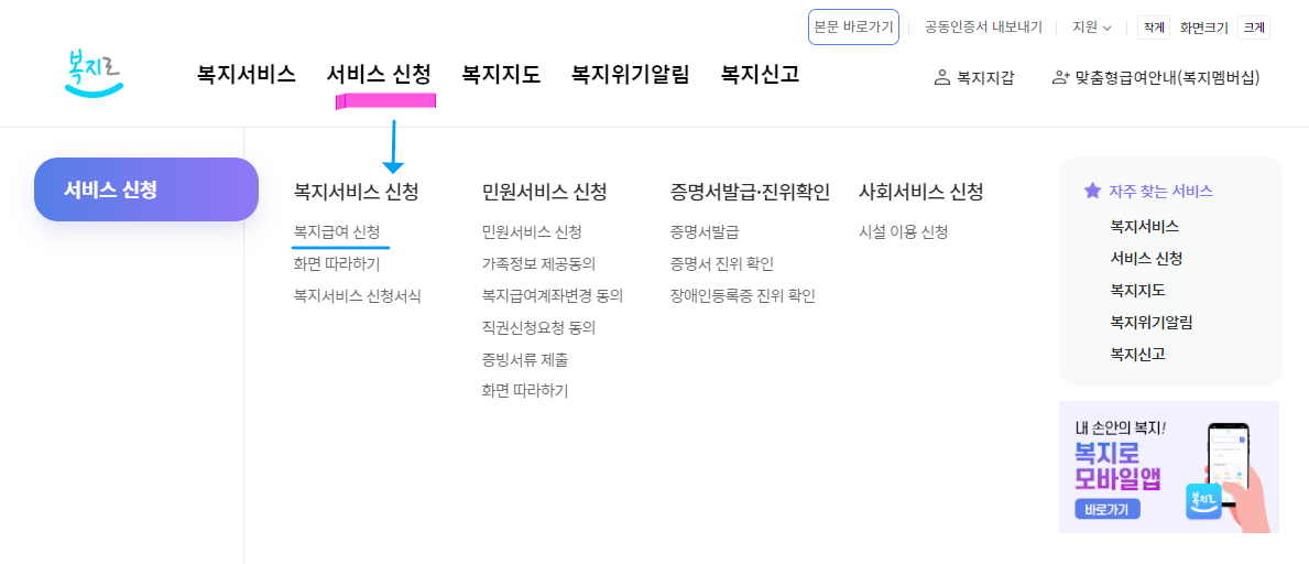 온라인 신청은 '복지로' 에서 간편하고 쉽게 가능